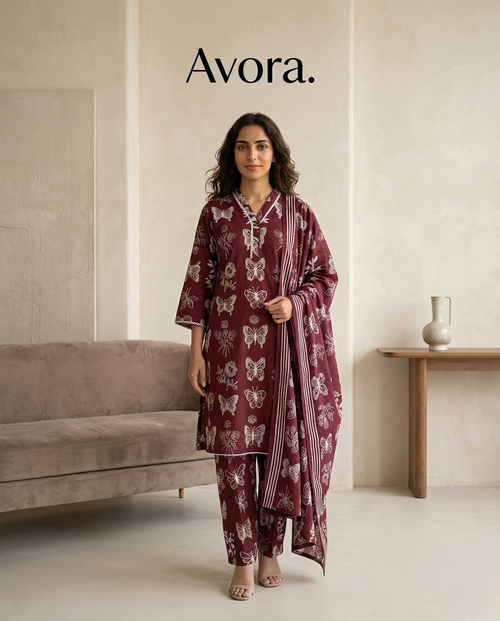 2 Pcs Women’s Linen Butterfly Printed Set – Maroon